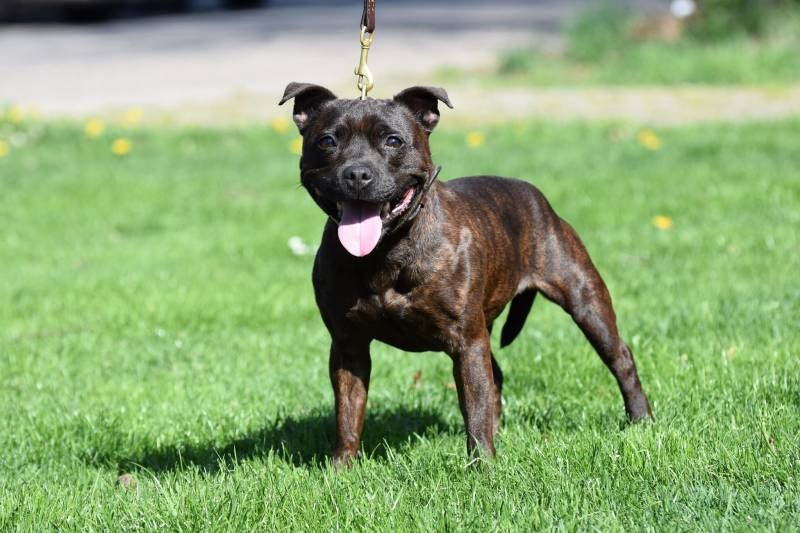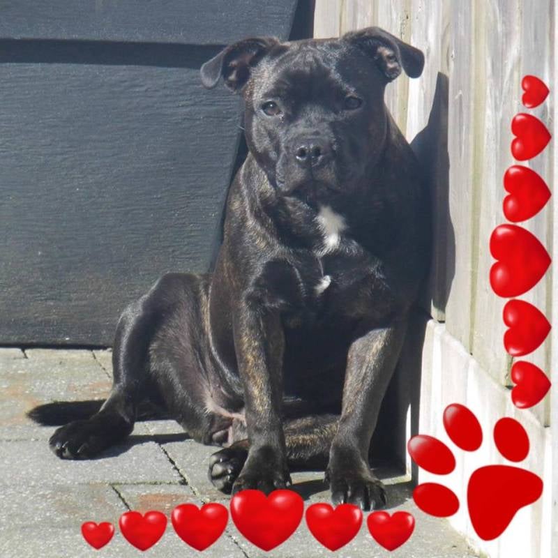 Black Brindle with wite , Lovely Bitch with a very nice head. She has good bone and a good front. Well padded feed. She balanced out quit well but very hyperactive at her first show